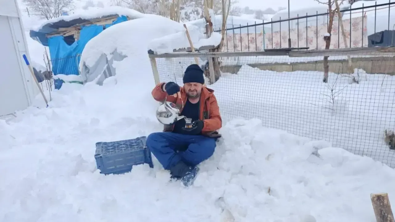 Akçadağ ilçesine bağlı Kozluca Mahallesi’nde esnaflık yapan Mehmet Demirkaya, kar kalınlığının bir metreye yaklaştığı bölgede kardan soba yaptı. Kardan yaptığı sobanın üzerinde çay demleyen Demirkaya, soğuk havaya aldırış etmeden çayını yudumladı.