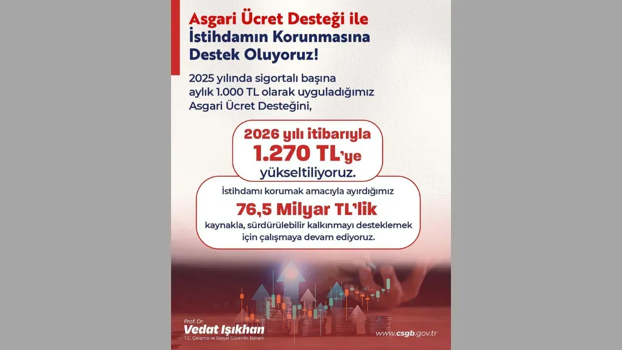 Bakan Işıkhan, sosyal medya hesabından yaptığı paylaşımla Asgari Ücret Desteğini, 2026 yılı itibarıyla bin 270 liraya yükseltildiğini hatırlatarak gelecek yıl 76.5 milyar liralık kaynakla çalışma hayatının daha güçlü olacağını ve istihdam kapasitesinin korunacağını bildirdi. Aynı zamanda Işıkhan, istihdamı destekleyecek politikaların kararlılıkla sürdürüleceğini belirtti.