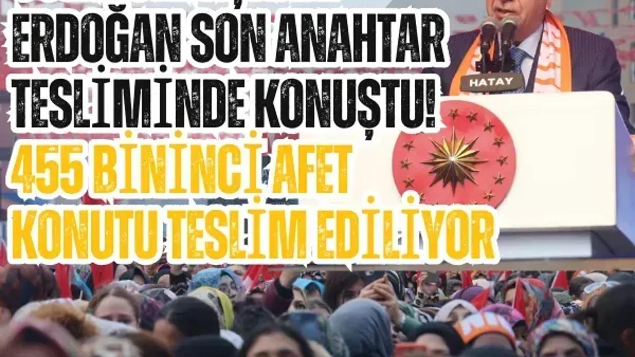 Cumhurbaşkanı Recep Tayyip Erdoğan 455 bininci konutu teslim etmenin gururunu yaşadıklarını ifade ederek, "İşte bugün dünyada hemen hiçbir ülkenin altından kalkamayacağı büyük bir başarıya Hatay'ımızda bizzat tanıklık ediyoruz. Depremin vurduğu on bir ilimizde yapımı tamamlanan 455 bininci afet konutumuzu hak sahibi kardeşlerimize teslim etmenin gururunu yaşıyoruz. Bu yuvalarda yepyeni bir hayatın sayfasını açacak tüm vatandaşlarımıza hayırlı, uğurlu olsun diyor, hanelerine kavuşan her bir kardeşime sağlıklı, mutlu, bereketli ömürler diliyorum. Rabb'im bu evlerde inşallah ağız tadıyla oturmayı nasip eylesin" şeklinde konuştu.