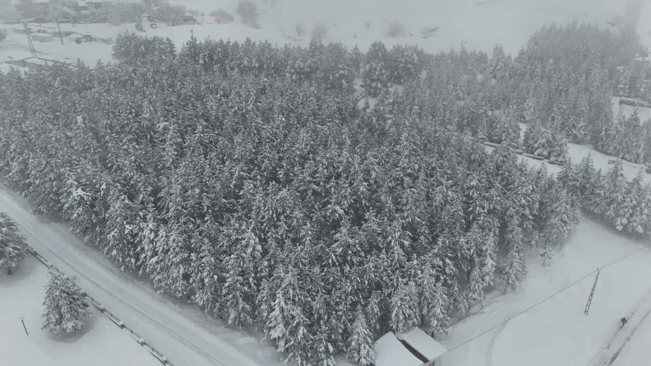 Kar yağışıyla birlikte havadan görüntülenen ilçede yetkililer sürücüleri ve vatandaşları kar yağışı nedeniyle dikkatli olmaları konusunda uyardı.