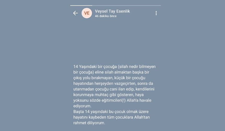 “14 Yaşındaki bir çocuğa (silah nedir bilmeyen bir çocuğa) eline silah almaktan başka bir çıkış yolu bırakmayan, küçük bir çocuğu hayatından herşeyden vazgeçirten, sonra da utanmadan çocuğu cani ilan edip, kendilerini korunmaya muhtaç gibi gösteren, haya yoksunu sözde eğitimcileri(!) Allah'a havale ediyorum. Başta 14 yaşındaki bu çocuk olmak üzere hayatını kaybeden tüm çocuklara Allah'tan rahmet diliyorum.”