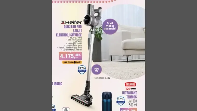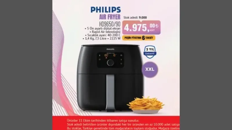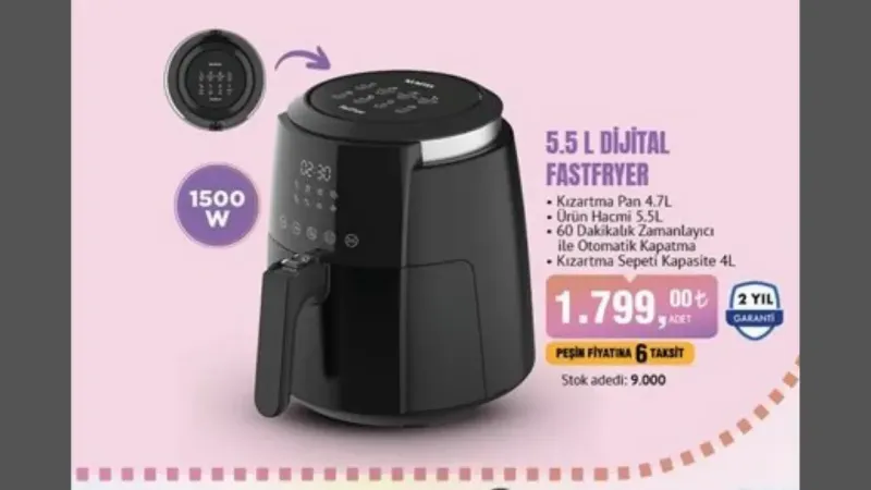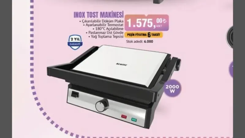 Aktüel ürünler kataloğunda yer alan paslanmaz üst yağ toplama tepsisine sahip inox tost makinesi ve 5 yıl motor garantili şarjlı elektrikli süpürge de dikkat çekerken, Philips markalı Air Fryer ise, hızlı pişirme teknolojisi ve dijital ekranı ile sağlıklı yemek hazırlamak isteyenler için ideal bir seçenek sunmakta. Stokların sınırlı olduğu bu kampanya, BİM müşterilerine uygun fiyatlarla kaliteli ürünler alma fırsatı sunuyor.