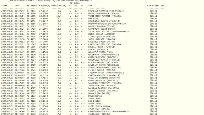 31 Temmuz saat 00.00 ila bugün saat 09.40 saatleri arasında Tunceli’de 20, Malatya’da 14, Kahramanmaraş’ta 11 sarsıntı meydana geldi. Meydana gelen sarsıntılardan iki tanesi Merkez üssü Malatya olan 4 üzeri olarak açıklanırken, iki tanesi 3 üzeri olarak meydana geldiği açıklandı.