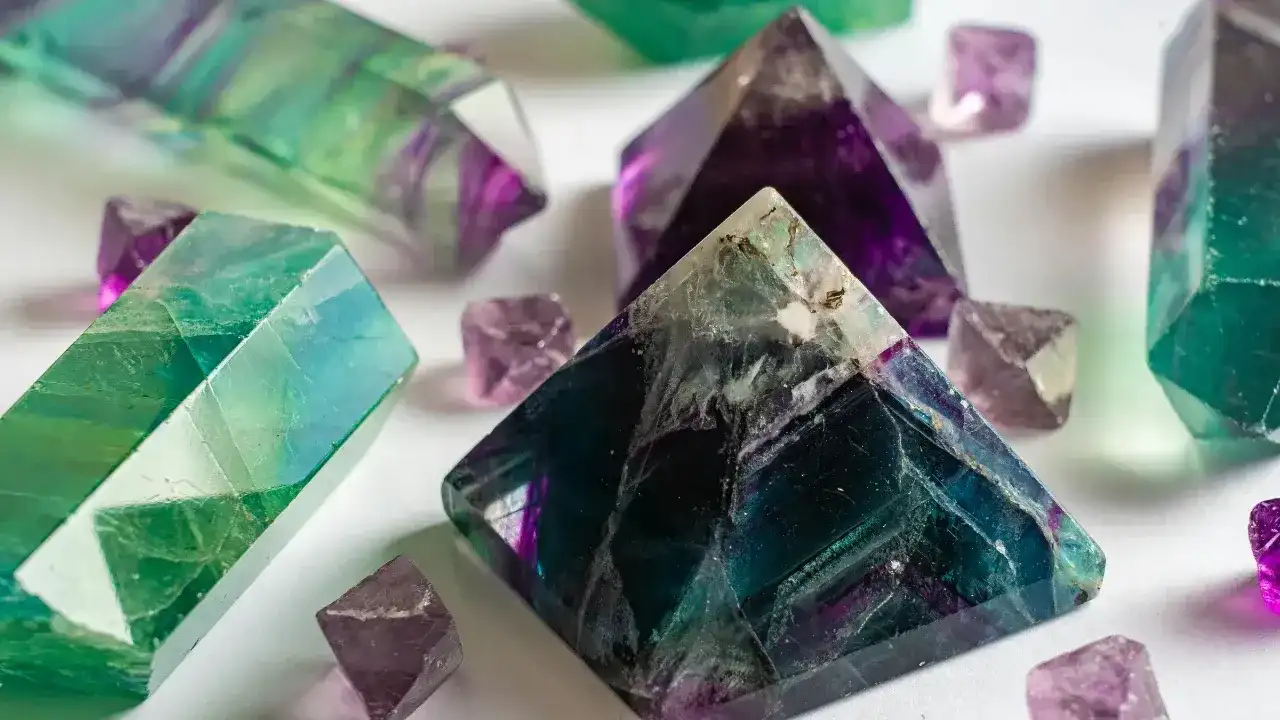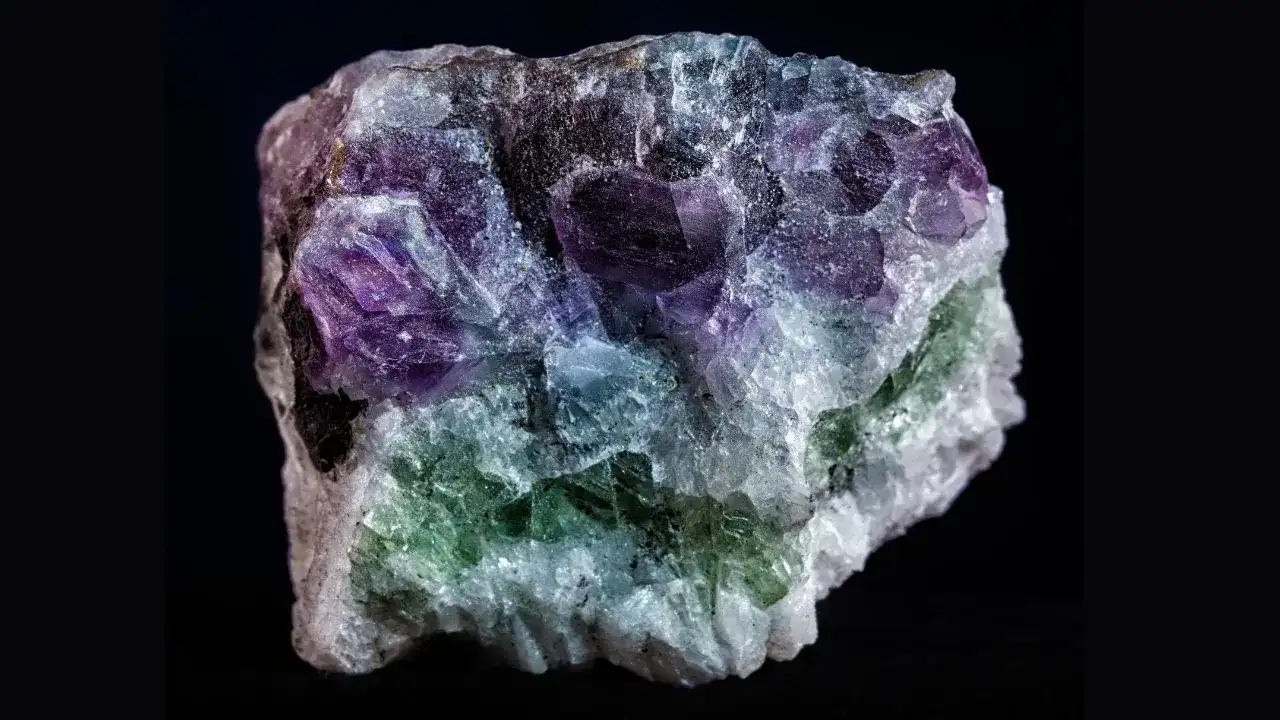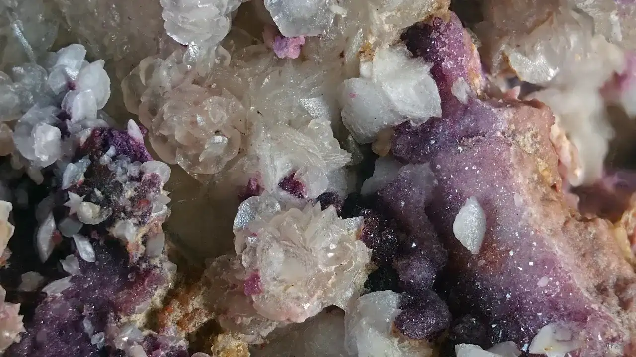 Florit (mor ve beyaz renkli) ile birlikte altın, kuvars, limonit, kalsit gibi mineraller bulunuyor.