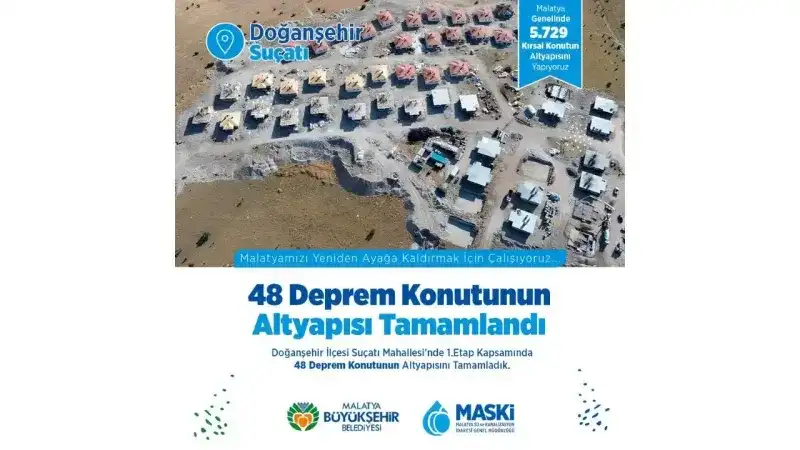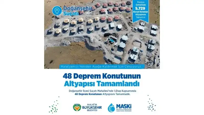 MASKİ ekipleri, Doğanşehir ilçesinin Suçatı Mahallesi'nde inşa edilen 48 deprem konutunun altyapı çalışmalarını da tamamladı. Bu projede de temel ihtiyaç olan su ve kanalizasyon hatları başta olmak üzere, altyapının eksiksiz bir şekilde tamamlanması sağlandı. Çalışmalar, bölgede hayatın normale dönmesine önemli katkılar sunuyor.
