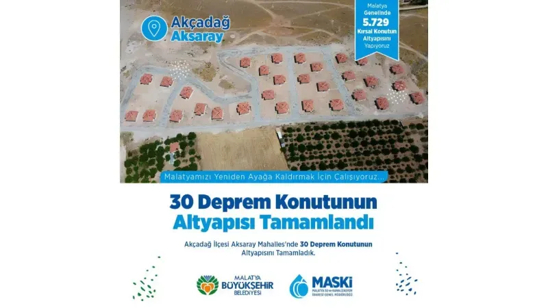 Akçadağ ilçesinin Aksaray Mahallesi'nde, depremin ardından inşa edilen konutların altyapı çalışmalarında sona gelindi. MASKİ, bölgede yapılan yeni deprem konutlarının altyapısını tamamladı. Depremzede vatandaşların güvenli ve modern bir yaşam alanına kavuşması için gerekli olan su, kanalizasyon ve diğer altyapı ihtiyaçlarının yerine getirildiğini belirtti.