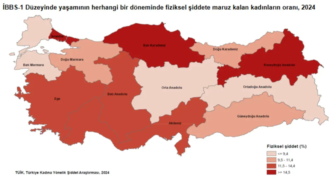 Verilere göre, yaşamının herhangi bir döneminde fiziksel şiddete maruz kalan kadınların oranı İBBS-1 düzeyine göre incelendiğinde, fiziksel şiddetin en çok görüldüğü bölge yüzde 25,9 ile Kuzeydoğu Anadolu Bölgesi iken en düşük olduğu bölge ise yüzde 8,8 ile Ortadoğu Anadolu Bölgesi oldu.