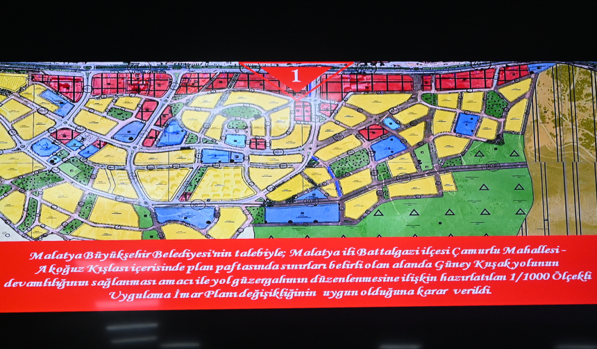 “Malatya Büyükşehir Belediyesi'nin talebiyle; Malatya ili Battalgazi ilçesi Çamurlu Mahallesi Akoğuz Kışlası içerisinde plan paftasında sınırları belirli olan alanda Güney Kuşak yolunun devamlılığının sağlanması amacı ile yol güzergahının düzenlenmesine ilişkin hazırlatılan 1/1000 Ölçekli Uygulama İmar Planı değişikliğinin uygun olduğuna karar verildi.”