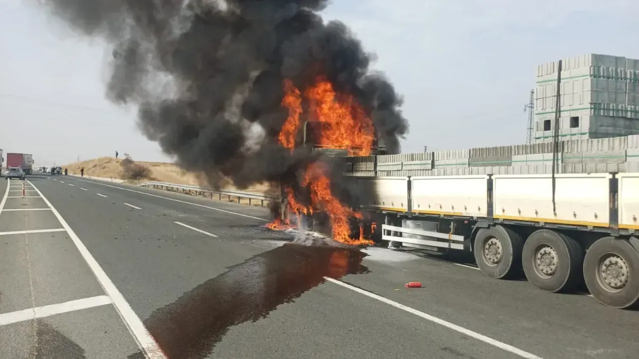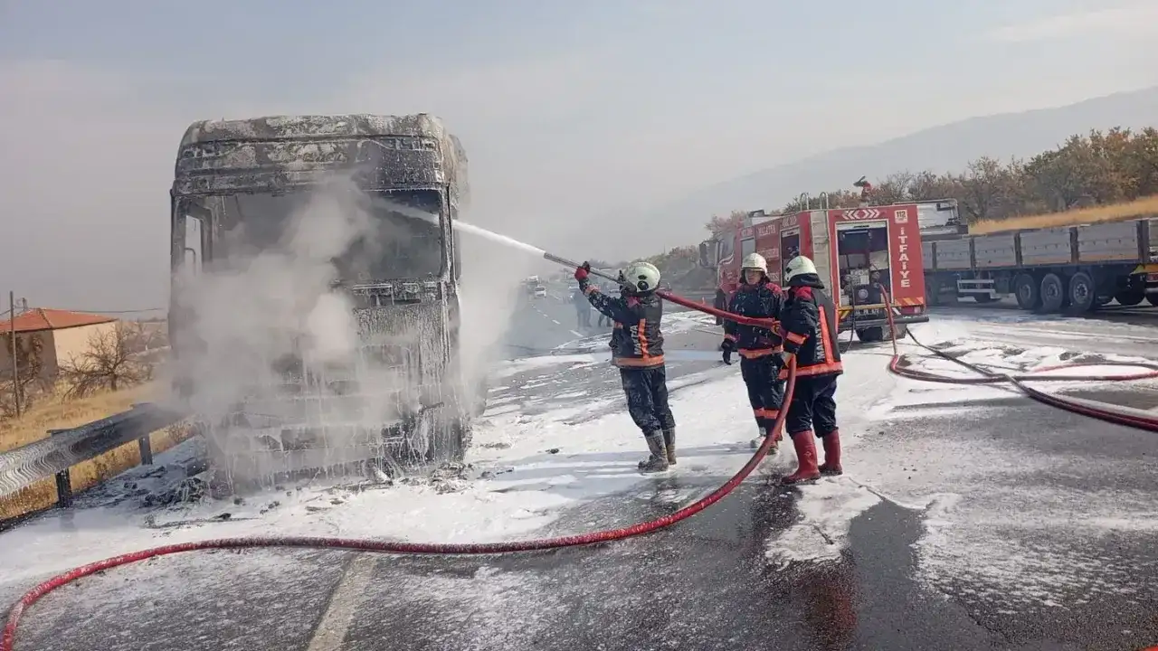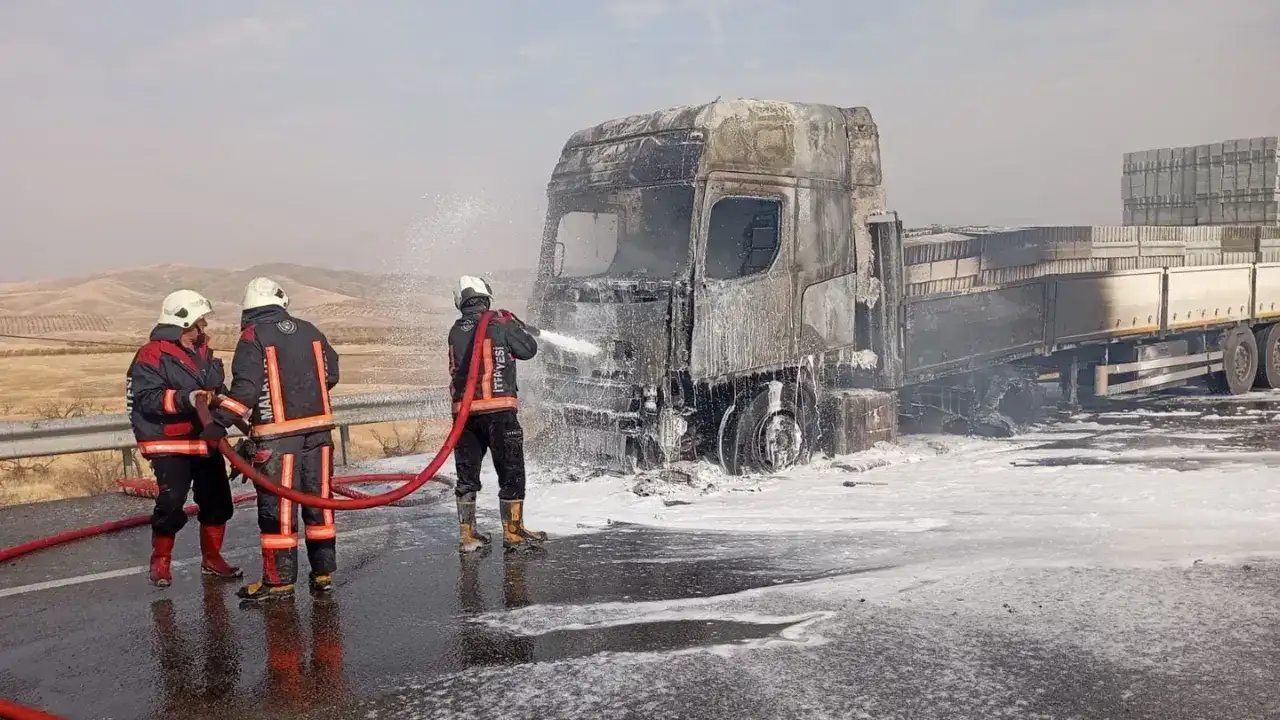 Elazığ-Malatya karayolu üzerinde seyir halinde olan inşaat malzemeleri yüklü bir TIR, Malatya'nın Kale ilçesi sınırlarında alev aldı.