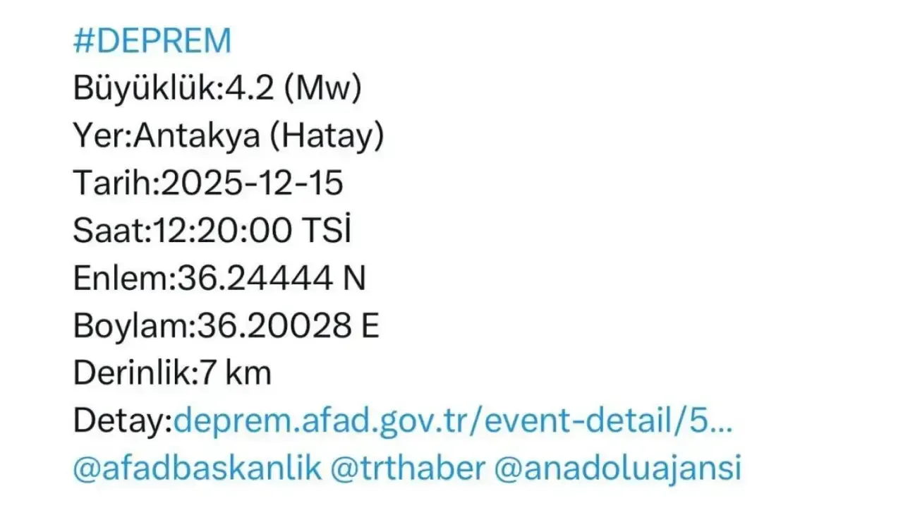 “Hatay Antakya ilçesinde 4,2 Mw büyüklüğünde deprem meydana gelmiştir. Şu ana kadar 112 Acil Çağrı Merkezine herhangi bir olumsuz ihbar gelmemiştir. Gelişmeler takip edilmektedir”