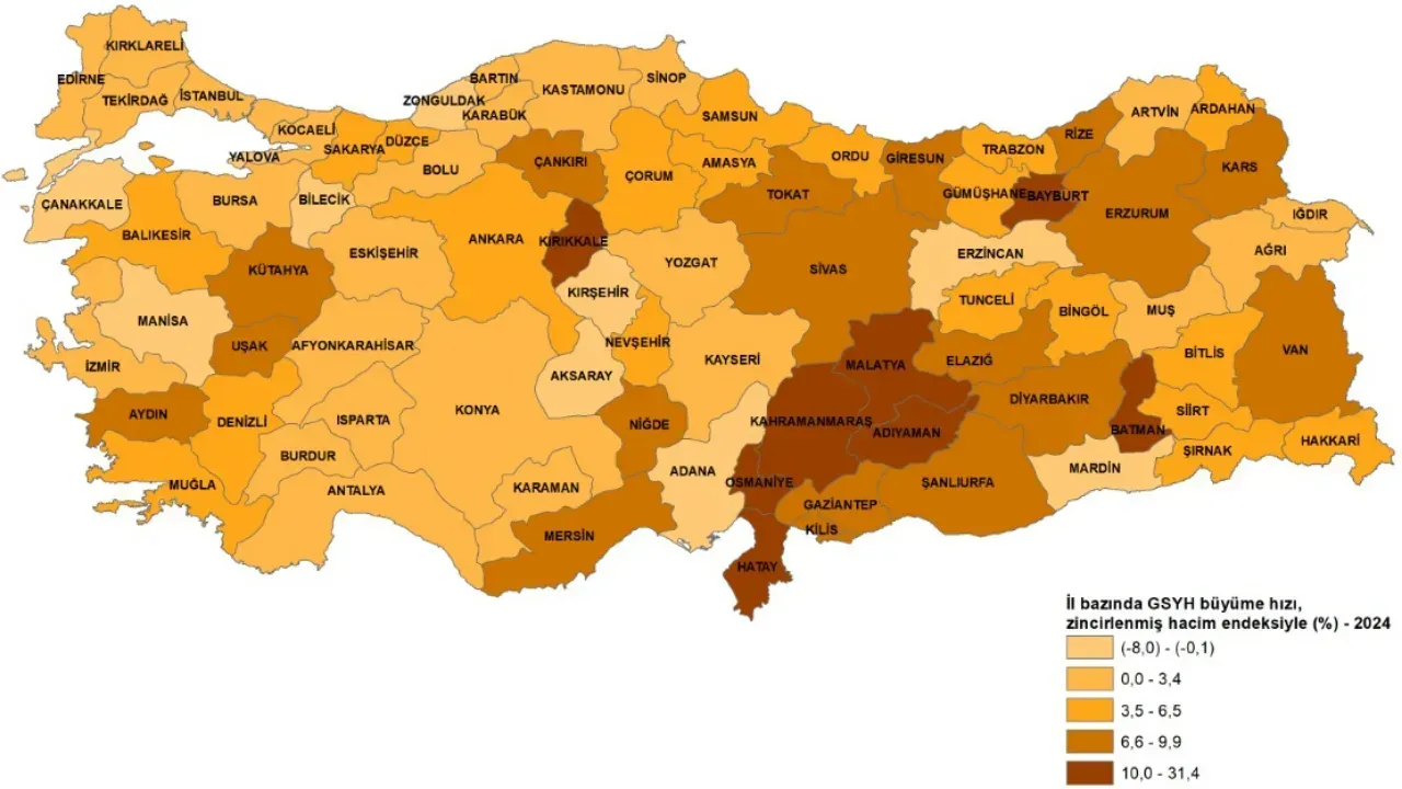 Yıllık GSYH, zincirlenmiş hacim endeksiyle bir önceki yıla göre 2024 yılında en yüksek artış gösteren ilk üç il sırasıyla Adıyaman, Bayburt ve Malatya yer alırken bir önceki yıla göre en yüksek azalış gösteren üç il ise sırasıyla Bilecik, Kırşehir ve Erzincan oldu.