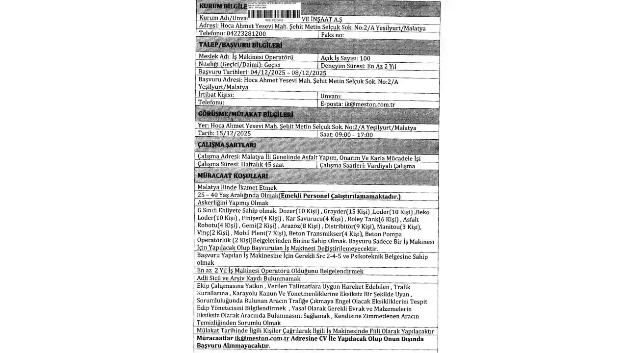 Malatya’da iş arayanlara güzel haber Malatya Büyükşehir Belediyesi tarafından geldi. Yayımlanan ilana göre belediye iştiraklerinden MESTON 100 İş Makinesi Operatörü alımı yapacak.