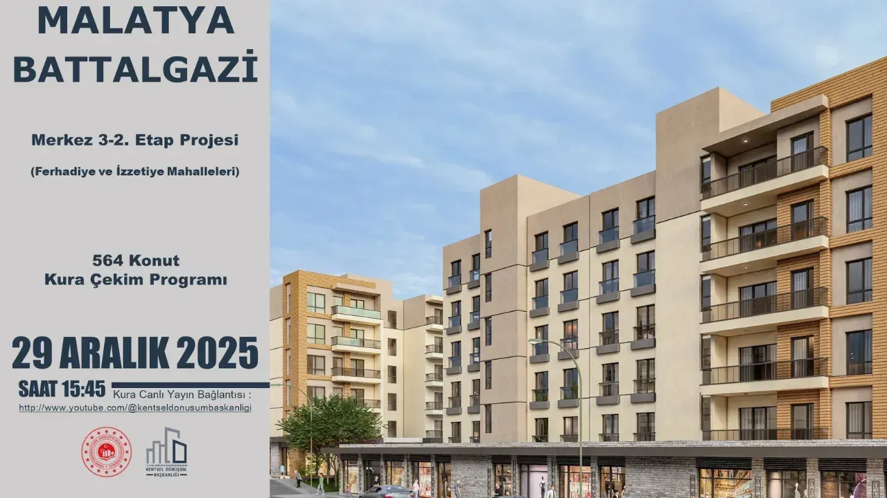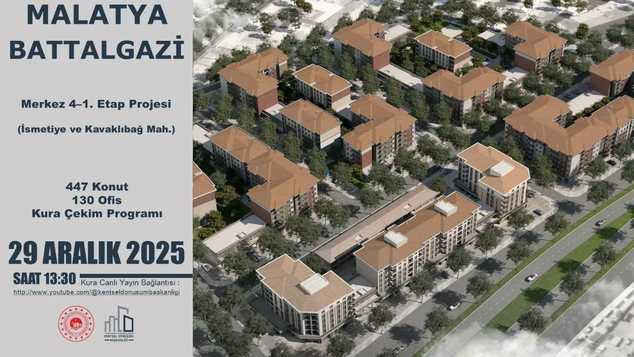 29 Aralık 2025 Pazartesi: Saat 13.30’da Battalgazi ilçesinde Merkez 4-1 Etap Projesi kapsamında yapımı tamamlanan (İsmetiye ve Kavaklıbağ Mahalleleri) 447 konut ve 130 ofisin kura çekimi noter huzurunda gerçekleştirilecek.