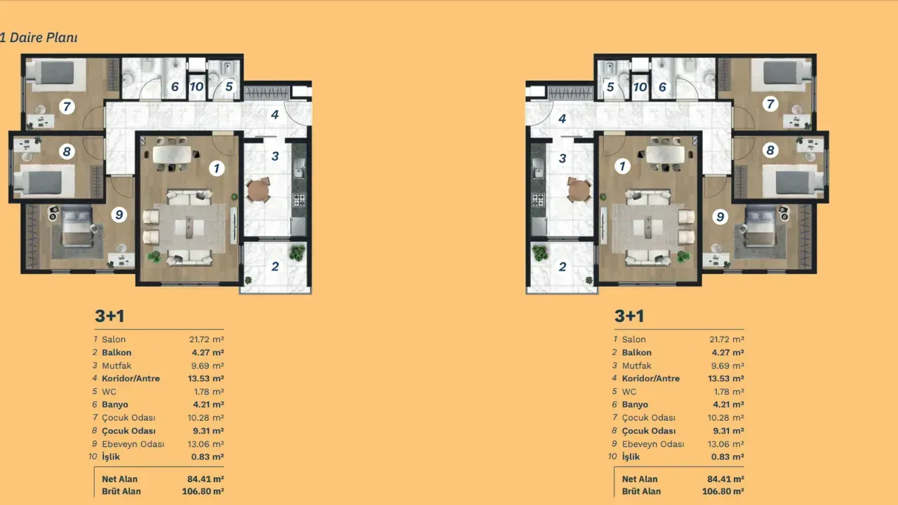 3+1 DAİRE PLANI - NET ALAN 84.41 METREKARE