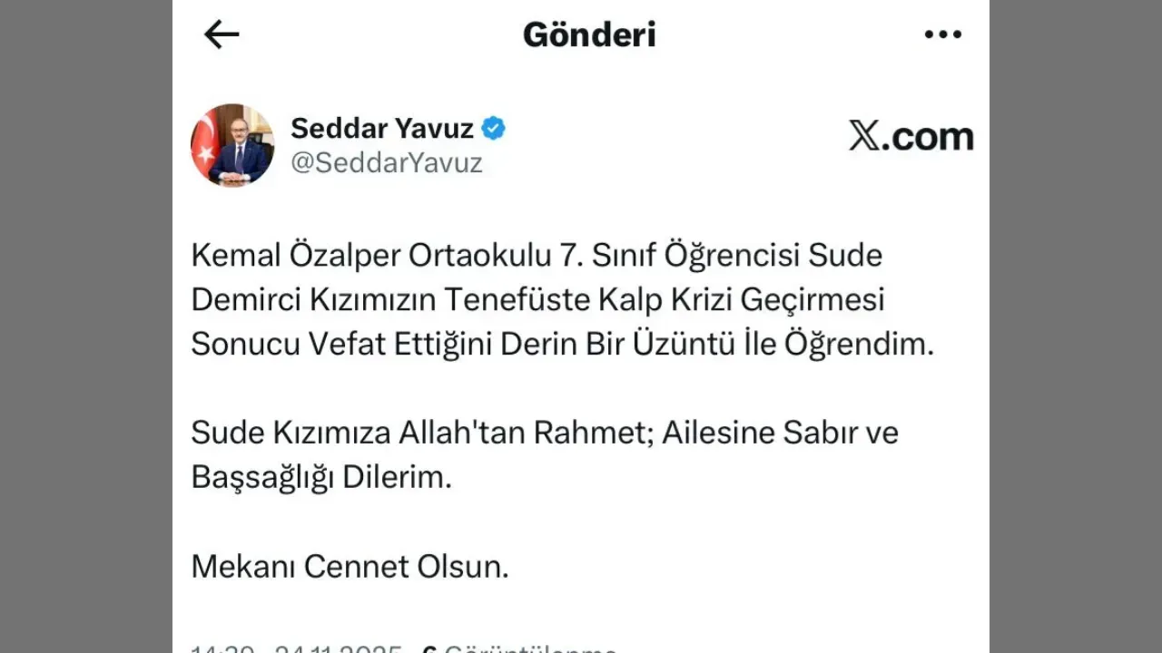“Kemal Özalper Ortaokulu 7. Sınıf Öğrencisi Sude Demirci kızımızın teneffüste kalp krizi geçirmesi sonucu vefat ettiğini derin bir üzüntü ile öğrendim. Sude kızımıza Allah’tan rahmet; ailesine sabır ve başsağlığı dilerim.”