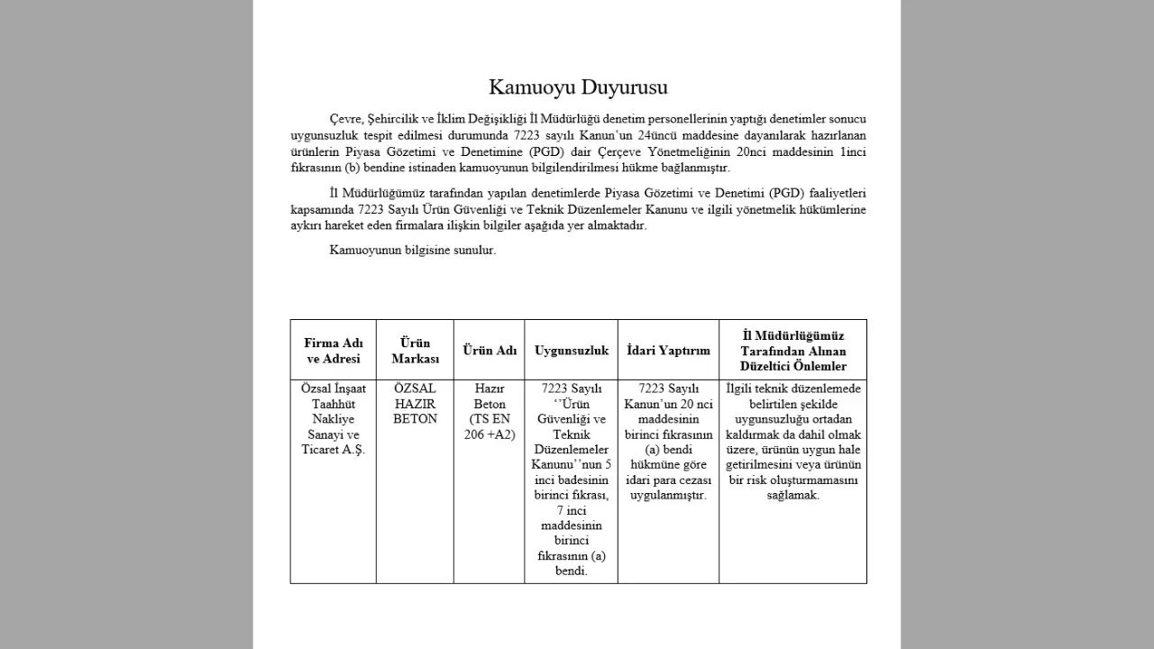 Özsal İnşaat Taahhüt Nakliye Sanayi ve Ticaret A.Ş. tarafından üretilen "Özsal Hazır Beton" markalı ürünlerin (TS EN206 +A2), 7223 Sayılı Ürün Güvenliği ve Teknik Düzenlemeler Kanunu’na aykırı olduğu tespit edilerek, kanunun 5. maddesinin birinci fıkrası ile 7. maddesinin birinci fıkrasının (a) bendine aykırılık teşkil eden durumlar nedeniyle firmaya idari para cezası uygulandığı açıklandı.