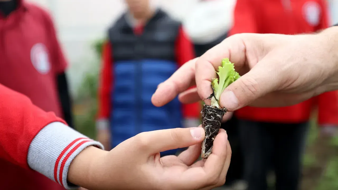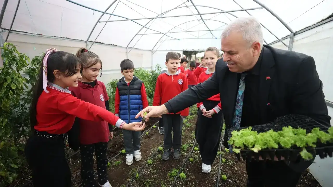 Okul bahçesinde atıl durumdaki alana 50 metrekare sera kuran Erginsoy, öğrencileriyle marul, taze soğan ve taze fasulye üretiyor.