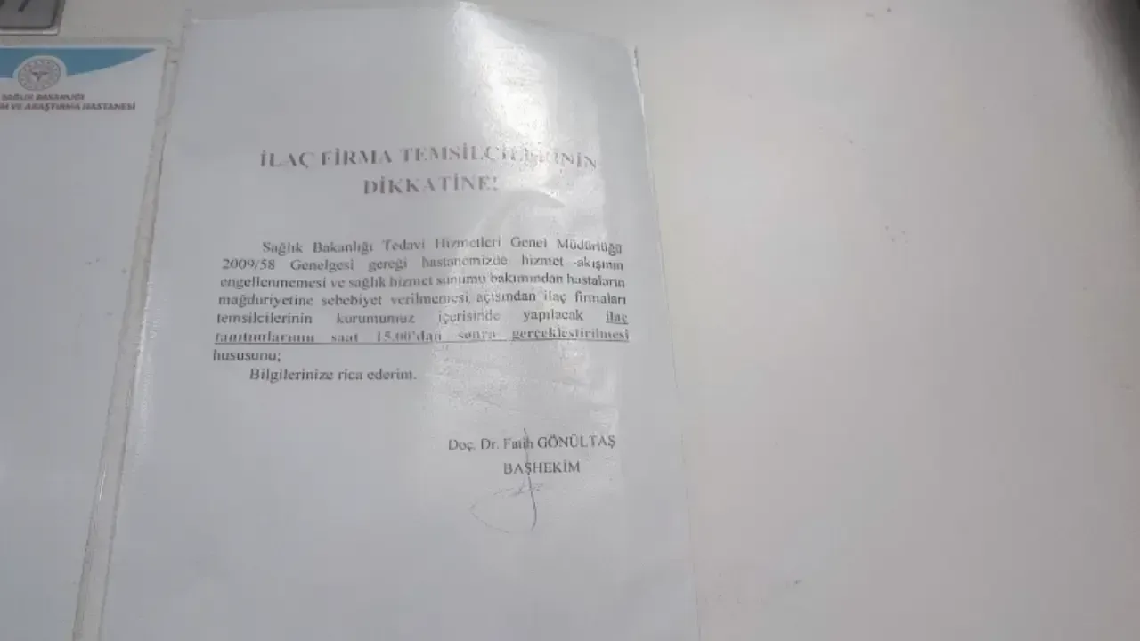 Hastane yönetimi, Sağlık Bakanlığı Tedavi Hizmetleri Genel Müdürlüğü’nün 2009/58 sayılı genelgesi doğrultusunda, poliklinik kapılarına dikkat çekici bir uyarı metni asmıştı. Başhekim Doç. Dr. Fatih Gönültaş’ın imzasını taşıyan yazıda, ilaç firması temsilcilerinin hastane içindeki tanıtım faaliyetlerini saat 15.00’ten sonra yapmaları gerektiği açıkça belirtilmişti.