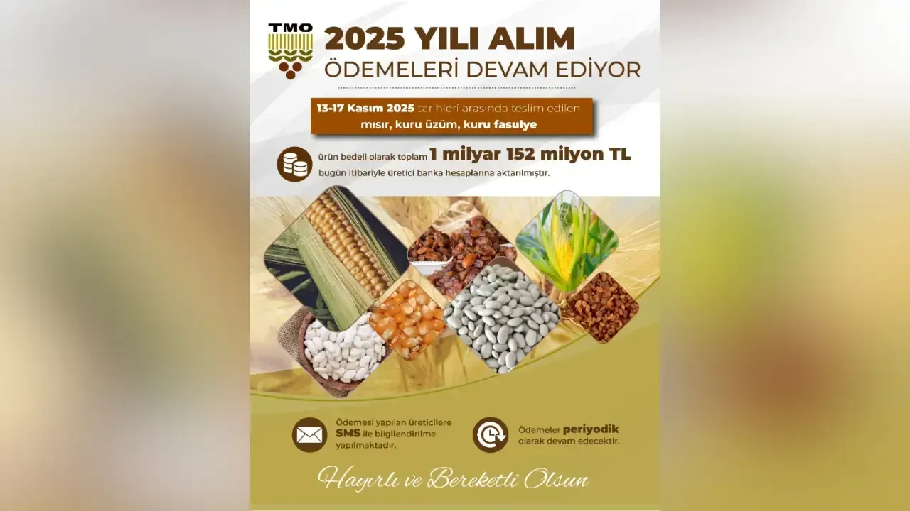 TMO’nun açıklamasına göre, 13–17 Kasım 2025 tarihleri arasında teslim edilen mısır, kuru üzüm ve kuru fasulye ürünleri için toplam 1 milyar 152 milyon TL ödeme yapıldı. Söz konusu tutarın, bugün itibarıyla üreticilerin banka hesaplarına aktarıldığı bildirildi.