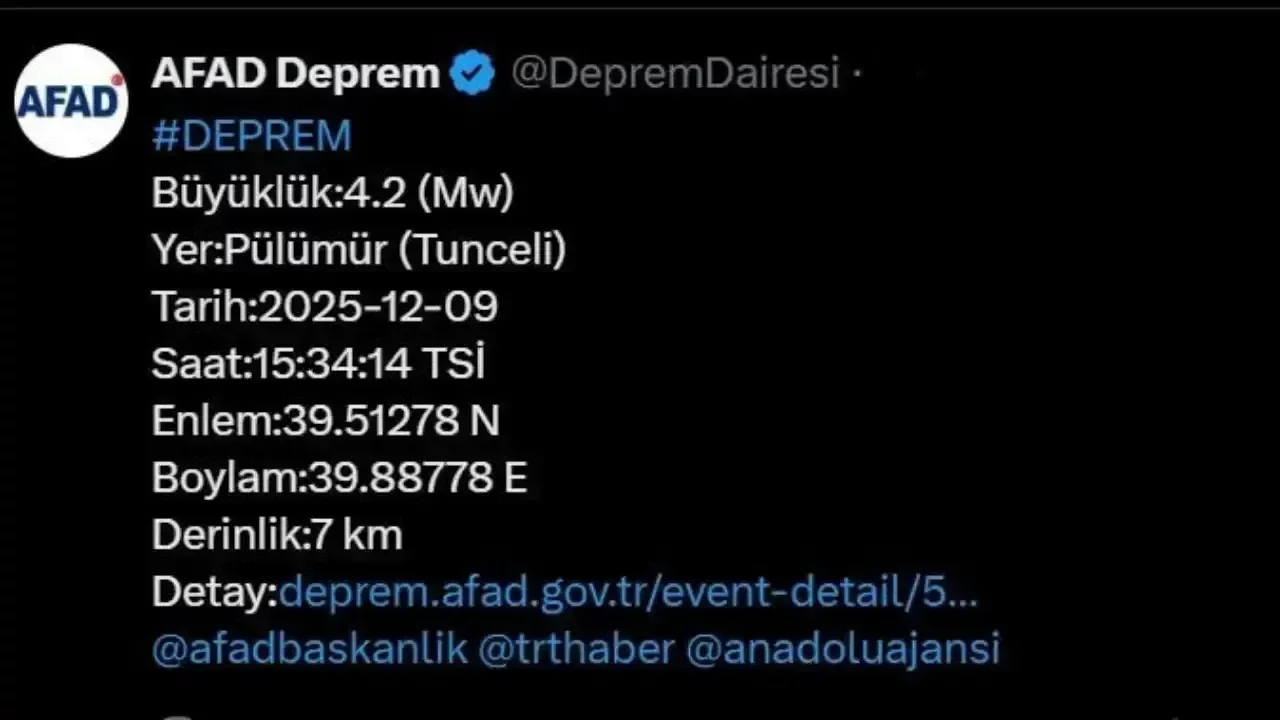 Merkez üssü Tunceli’nin Pülümür ilçesi olan 4.2 büyüklüğünde deprem, bugün saat 15.34’te kaydedildi. Yerin yaklaşık 7 kilometre derinliğinde meydana gelen sarsıntı, çevre ilçelerde de hissedildi. Afet ve Acil Durum Yönetimi Başkanlığı (AFAD) yetkilileri, depremle ilgili yapılan incelemelerde herhangi bir olumsuz durumun tespit edilmediğini bildirdi.