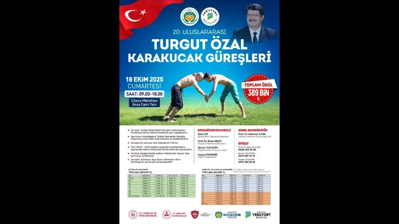 Gençlik ve Spor Bakanlığı, Yeşilyurt Kaymakamlığı ve Türkiye Geleneksel Güreşler Federasyonun destekleriyle Malatya Büyükşehir Belediyesi ve Yeşilyurt Belediyesinin ortaklaşa düzenleyeceği 20.Uluslararası Turgut Özal Karakucak Güreşleri, 18 Ekim Cumartesi günü saat 09.00 ile 18.00 arasında Çilesiz Aksa Cami’nin yan tarafındaki alanda sporseverlerle buluşacak.